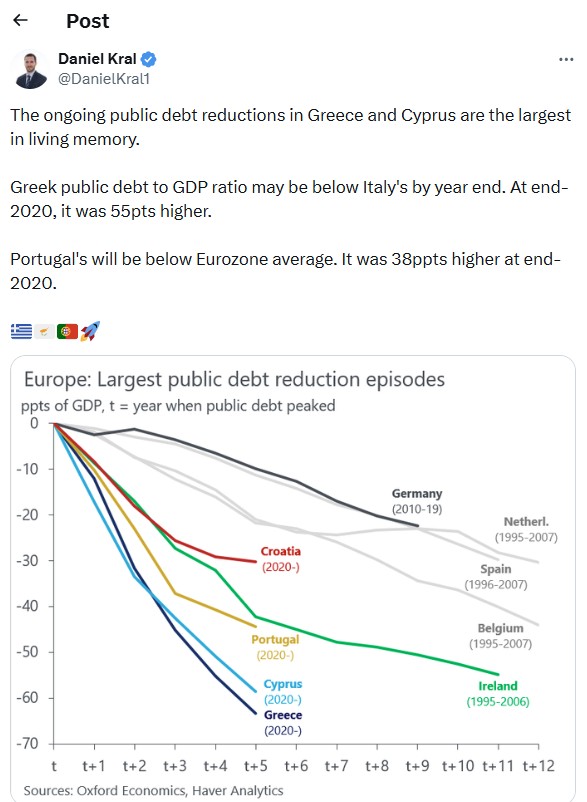“Greece is recording the fastest debt reduction in history,” emphasized Minister of National Economy Kyriakos Pierrakakis in a post on X. As Kyriakos Pierrakakis highlights, the rapid reduction of debt is a deliberate government choice, aimed at ensuring it is not passed on to the next generation.