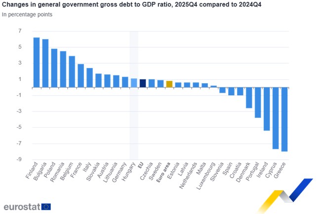 In practice, Greece’s debt-to-GDP ratio has returned to its most favorable levels since the summer of 2010, that is, since the launch of the first adjustment program. This outcome is attributed to prudent fiscal policy with the creation of primary surpluses, the early repayment of loans from the first bailout program and expensive IMF loans, as well as strong growth rates that boost GDP. During the same period, the European average improved by only 9.8 percentage points. As a result, the gap between Greece and the EU narrowed to 64.4 percentage points, compared to 121.4 points recorded at the beginning of 2021. The only country with comparable performance is Cyprus, which between 2021 and 2025 improved its debt-to-GDP ratio by 62.5 percentage points. On the other hand, eight member states saw their debt increase, while major economies such as Germany and France reduced their debt-to-GDP ratios by just 5.3 and 1.5 percentage points respectively, despite their traditionally lower borrowing costs.